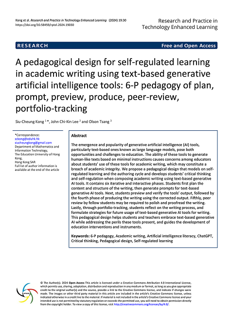 Kong, S.-C., Lee, J. C.-K., & Tsang, O. (2024). A pedagogical design for self-regulated learning in academic writing using text-based generative artificial intelligence tools: 6-P pedagogy of plan, prompt, preview, produce, peer-review, portfolio-tracking. Research and Practice in Technology Enhanced Learning, 19(030).