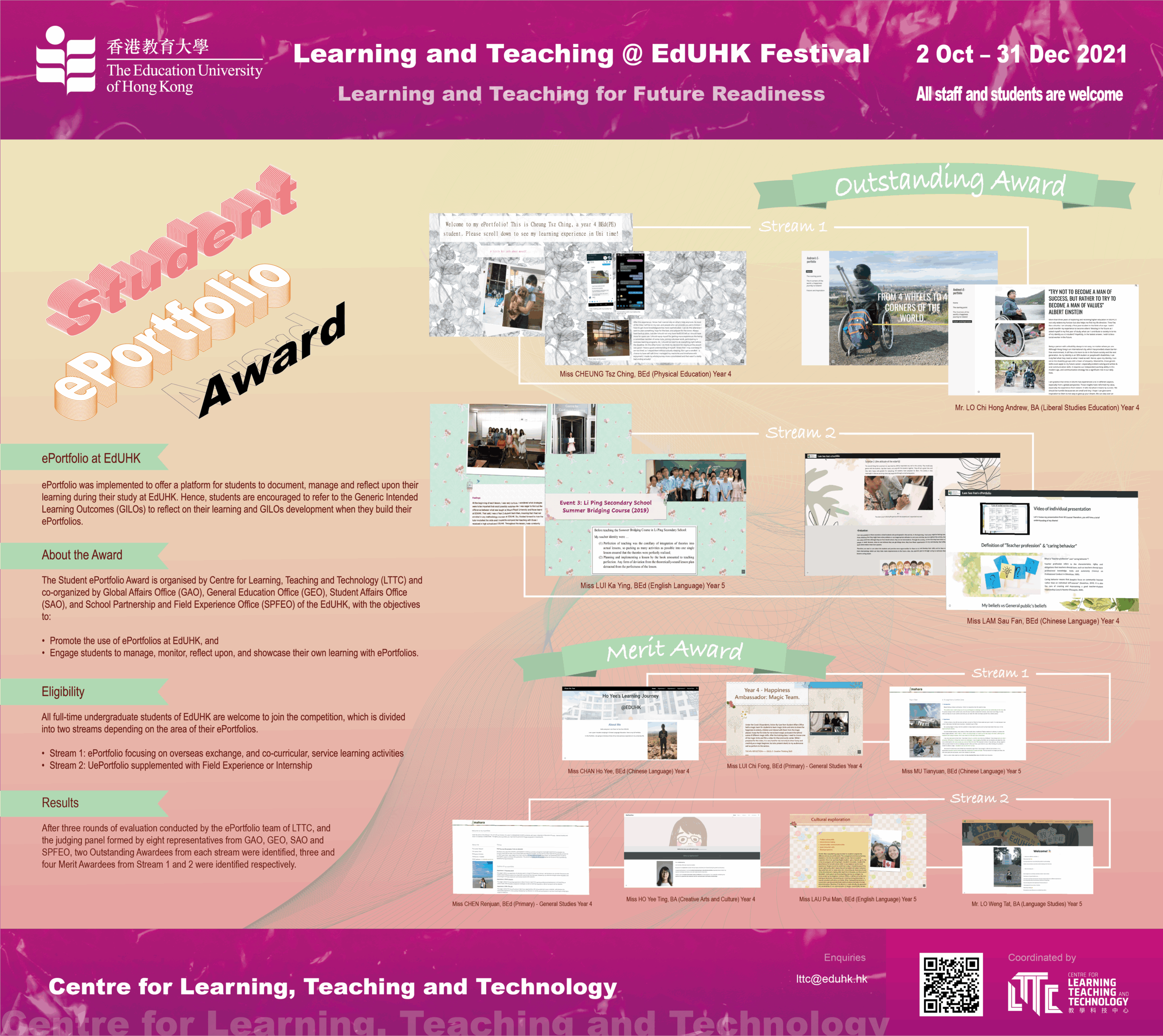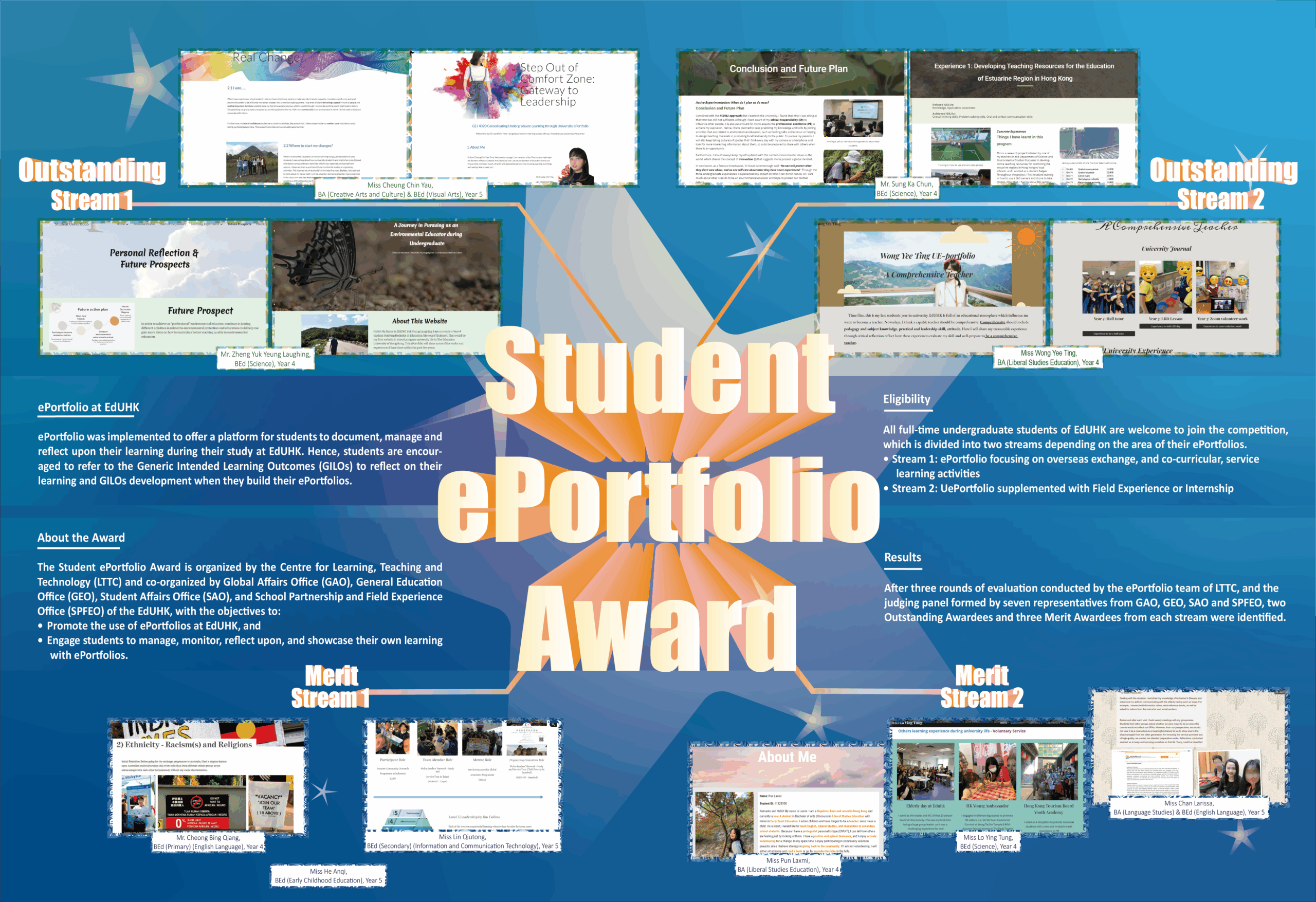 With the key objectives of nurturing engaged and reflective learners, ePortfolio has been implemented to offer a platform for students to document, manage and reflect upon their own learning during their study at EdUHK since 2012. Students are required to create ePortfolios to document and reflect on their formal and non-formal learning experiences in General Education, Language Enhancement, Co-curricular and Service Learning Activities and Overseas Exchange Opportunities. Students who are enrolled in teacher education programmes would also use ePortfolios to document and reflect their teaching practices for their Field Experience. Building the ePortfolio provides students with opportunities to consolidate and internalize the knowledge and skills acquired in various learning activities across their University learning journey.